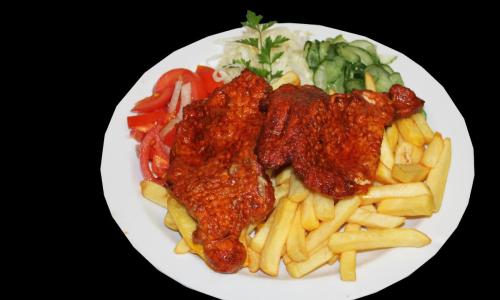 sertéskaraj rántva, sonkával, tejfeles ketchupos mártással, sajttal pirítva, hasábburgonyával