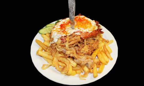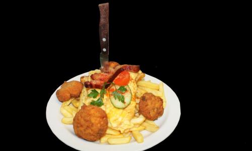 Natúr bélszín, sertésszelet, baconszalonna, szalonna, tükörtojás, sülthagyma karikák, hasábburgonya