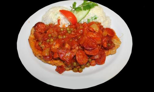 Roston sült sertéskaraj, füstölt szalonnás, vöröshagymás, lecsós, zöldborsó, kolbászos raguval